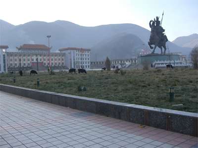 広場ではヤクが朝の放し飼いにされていた。
