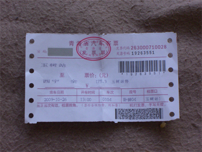 ↑玉樹→西寧の寝台バスチケット(176元)。