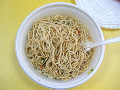 お湯を捨ててからソースをかけてかき混ぜて出来上がり。